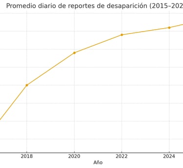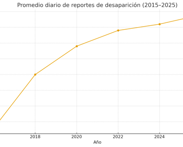 (Gráfica 1: Promedio diario de reportes de desaparición 2015–2025, fuente CNB/RNPDNO)